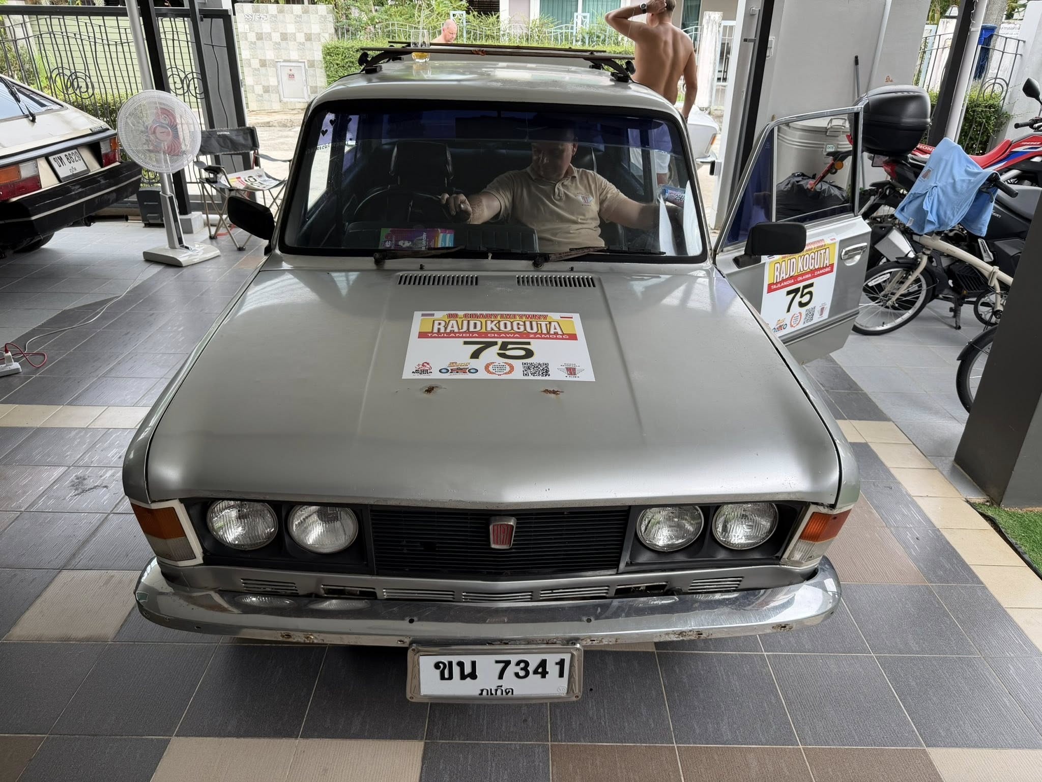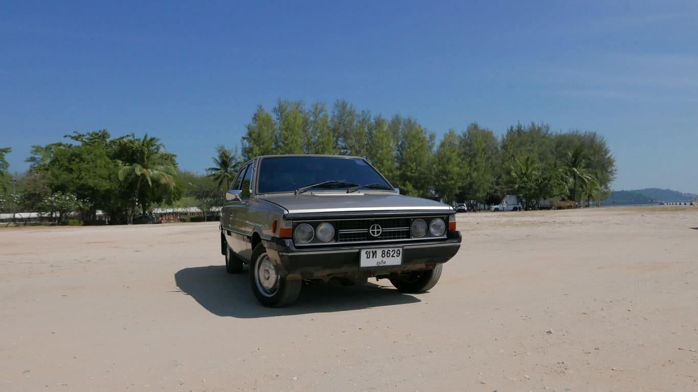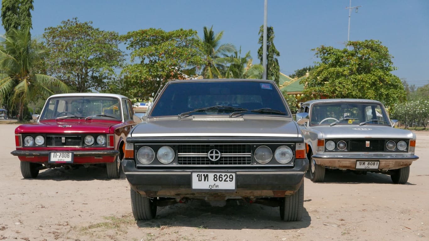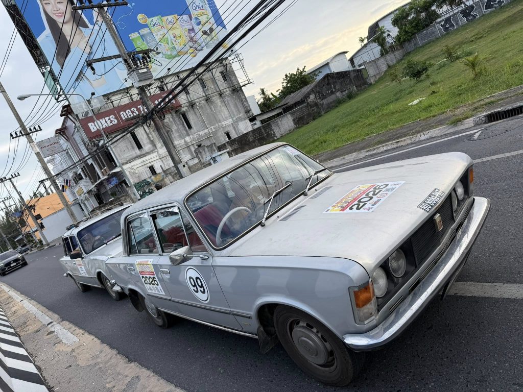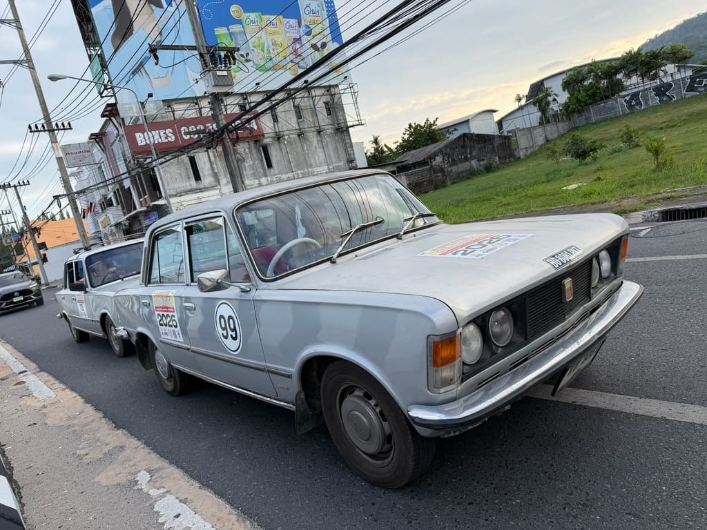 Klasyczny polski Fiat 125p z 1975 roku, który w Tajlandii otrzymał japoński silnik Nissan A15 1.5 i manualną skrzynię – symbol trwałości i azjatyckich modyfikacji, gotowy na powrót do domu.
