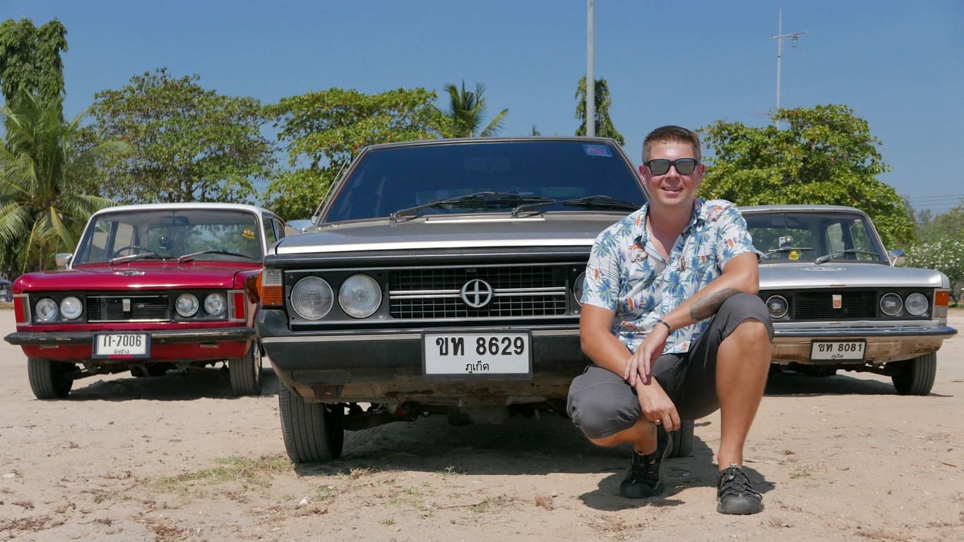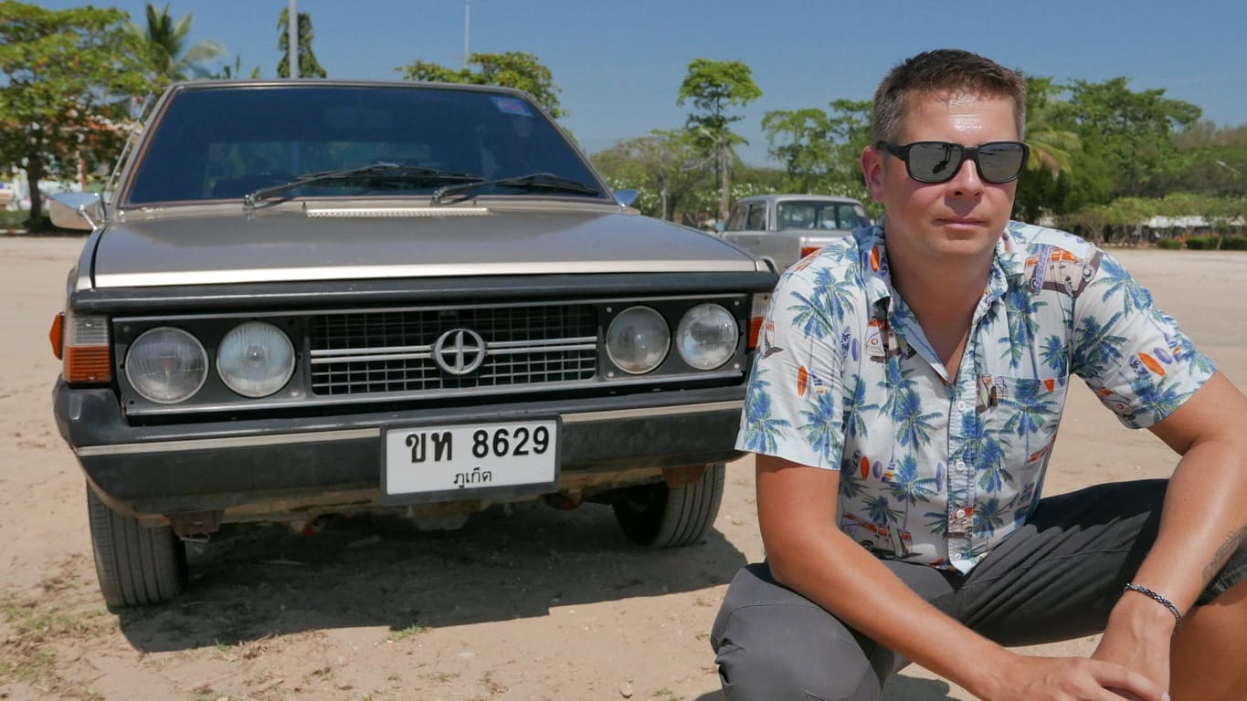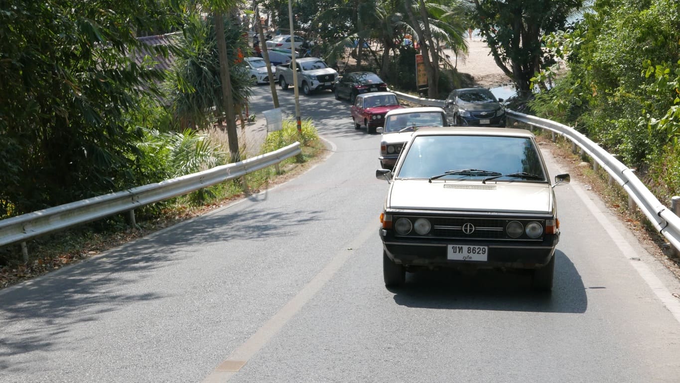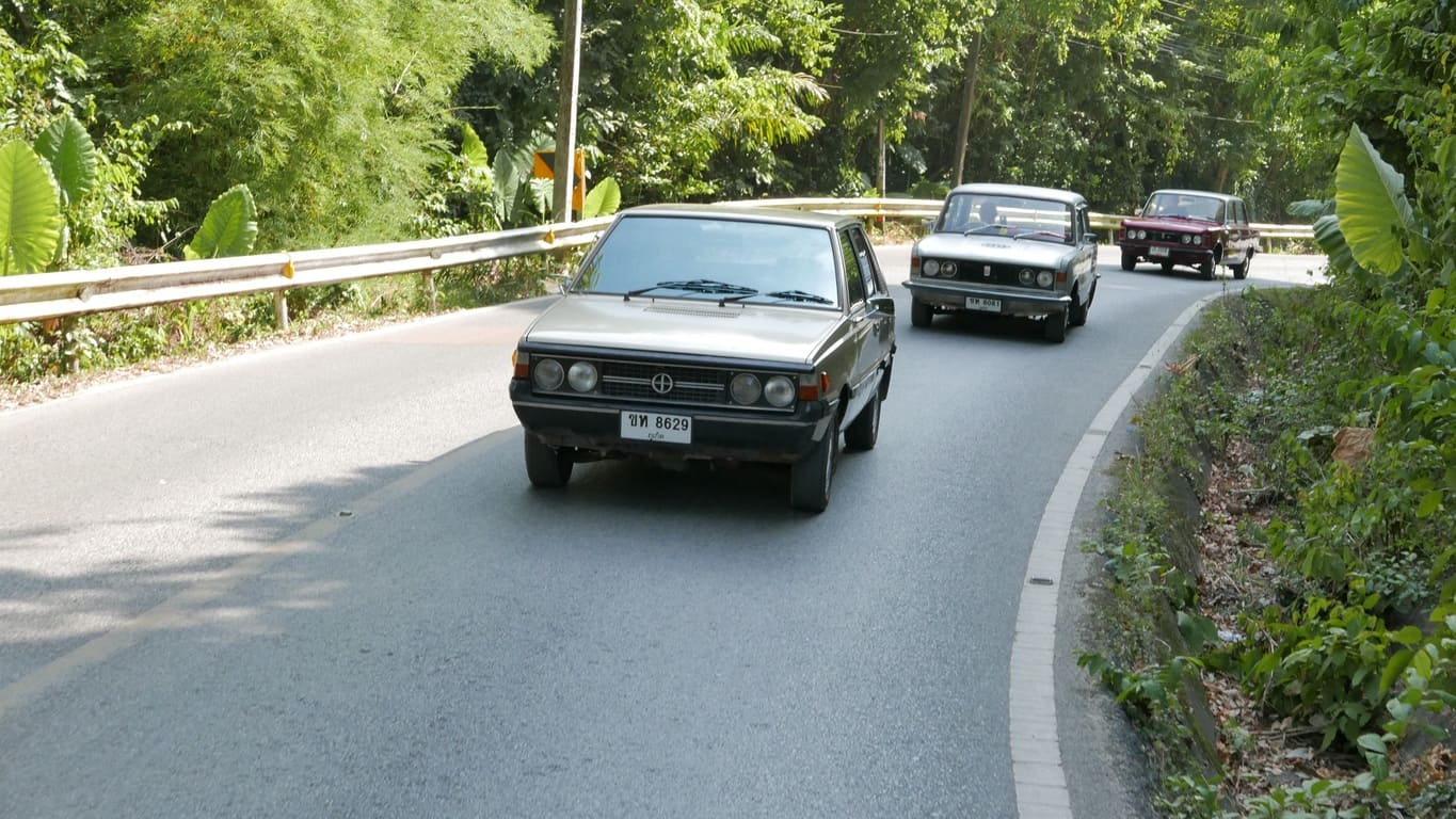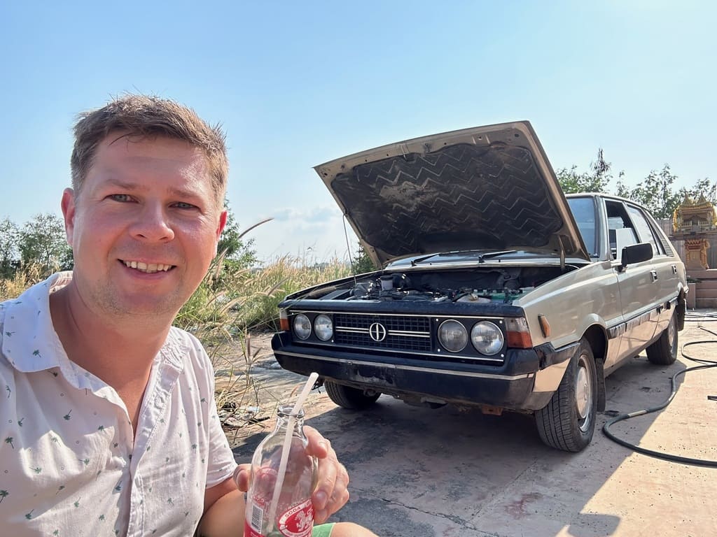 Klasyczny polski Fiat 125p z 1975 roku, który w Tajlandii otrzymał japoński silnik Nissan A15 1.5 i manualną skrzynię – symbol trwałości i azjatyckich modyfikacji, gotowy na powrót do domu.
